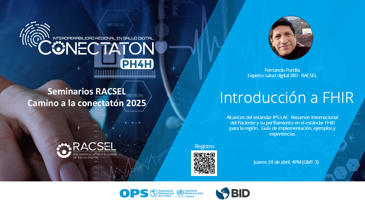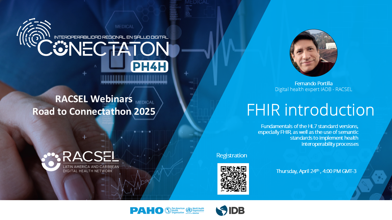 The first seminar will focus on introduce the fundamentals of HL7 standards, especially FHIR, as well as the use of semantic standards to implement interoperability processes in health. It will be led by Fernando Portilla, engineer and digital health specialist, and consultant for the IDB and RACSEL. The objective of these sessions is to strengthen participants' capacities and provide them with the tools necessary to successfully tackle the challenges of the connectathon.